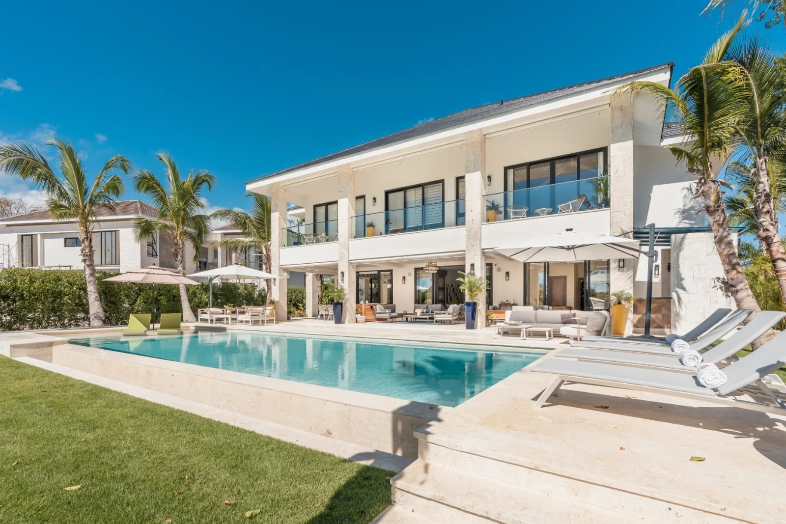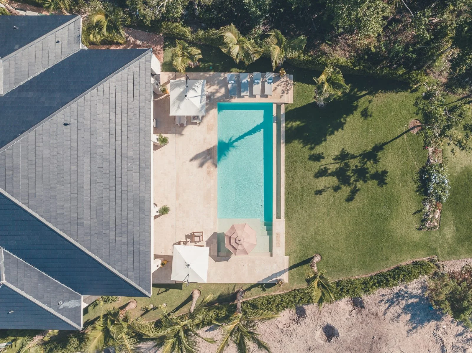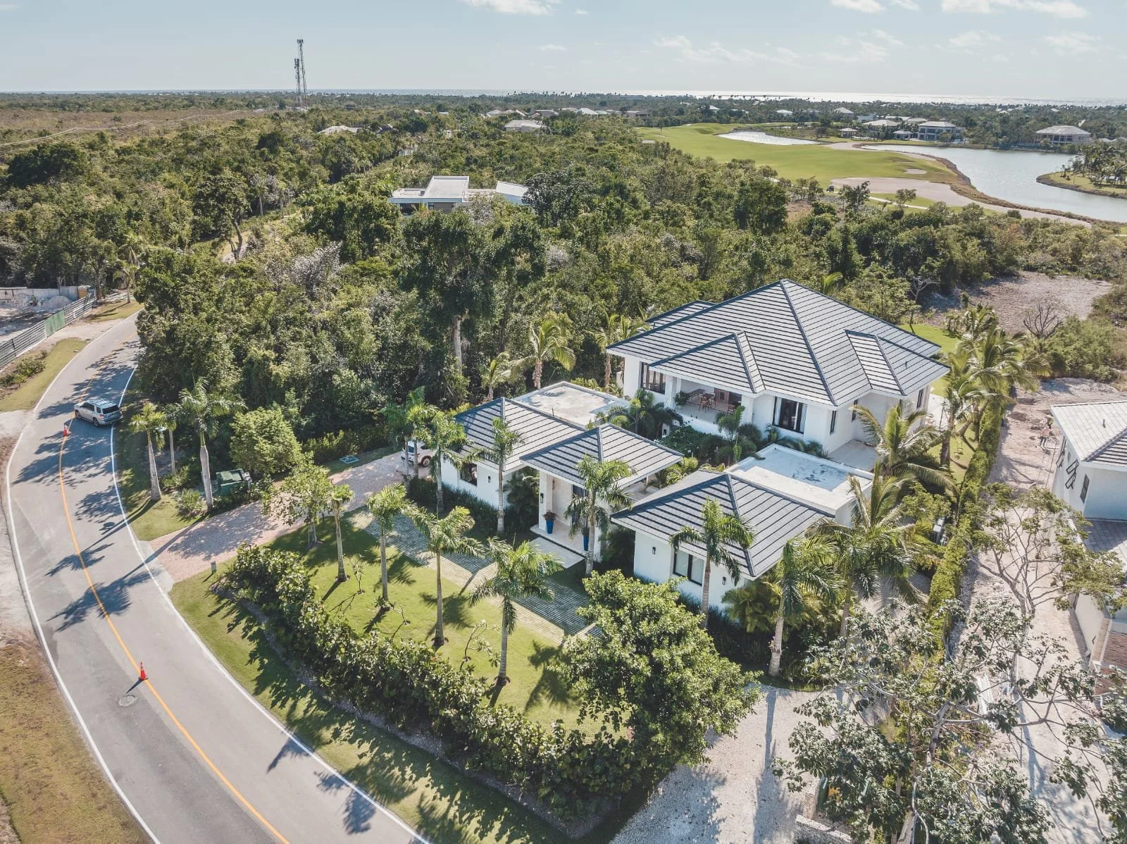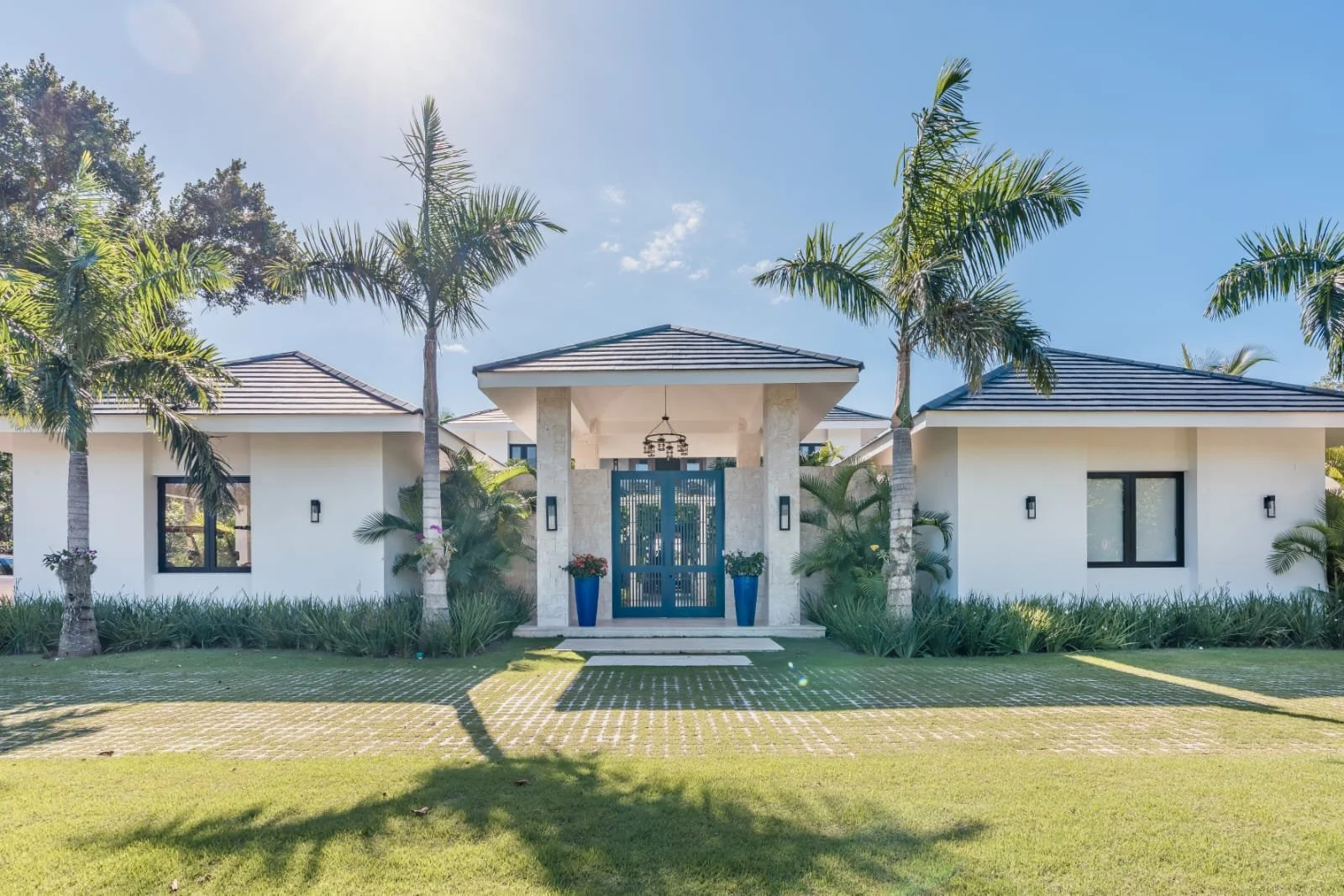 Hacienda B34, located in our HACIENDA GOLF COURSE, exudes elegance and luxury. It features a sprawling layout with a central structure, reflecting a modern yet tropical architectural style. The dark-tiled hip roof contrasts beautifully with the clean, white exterior walls, adding a sophisticated touch.