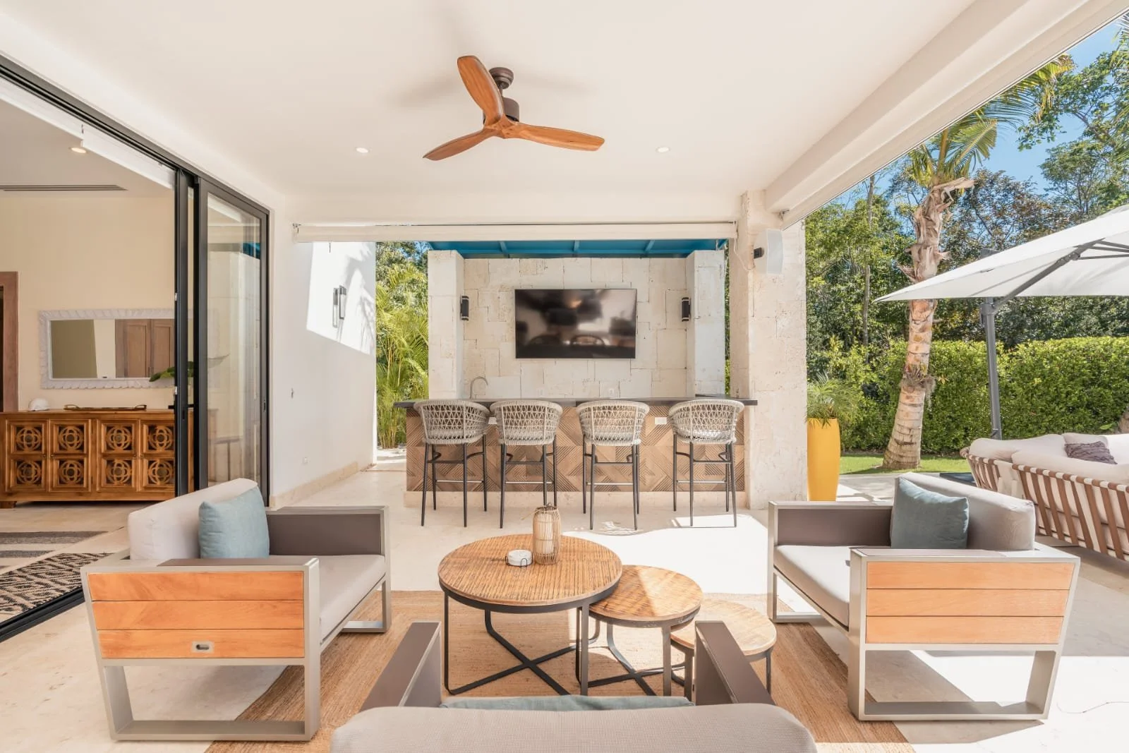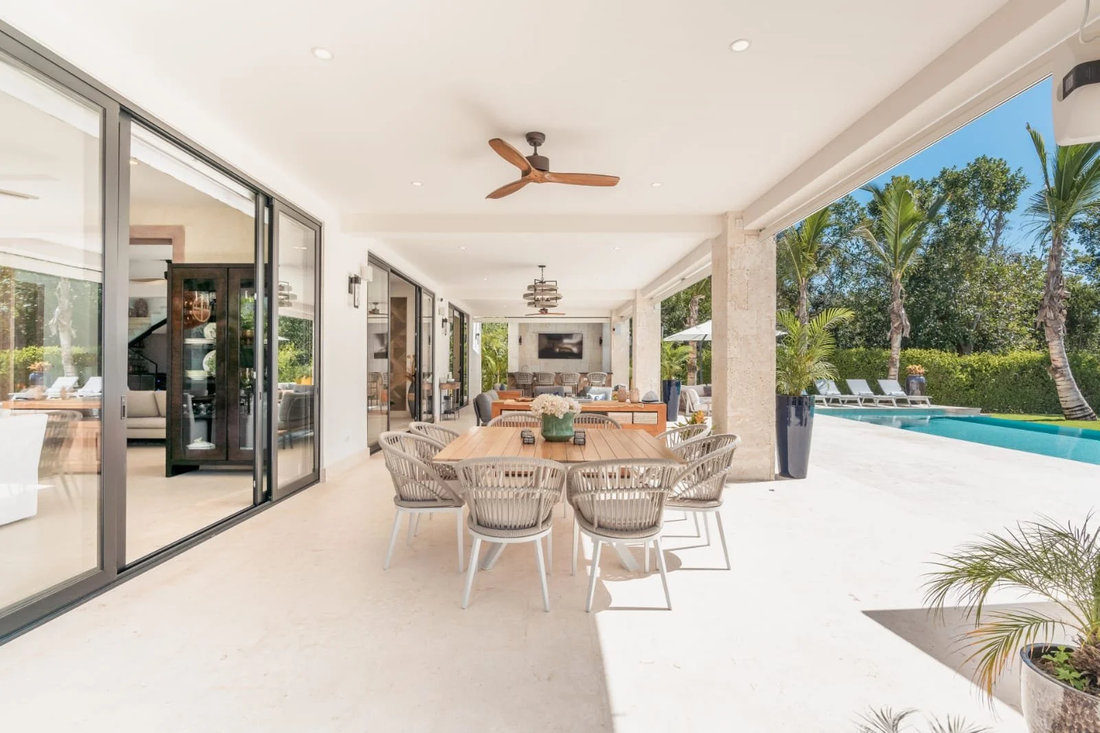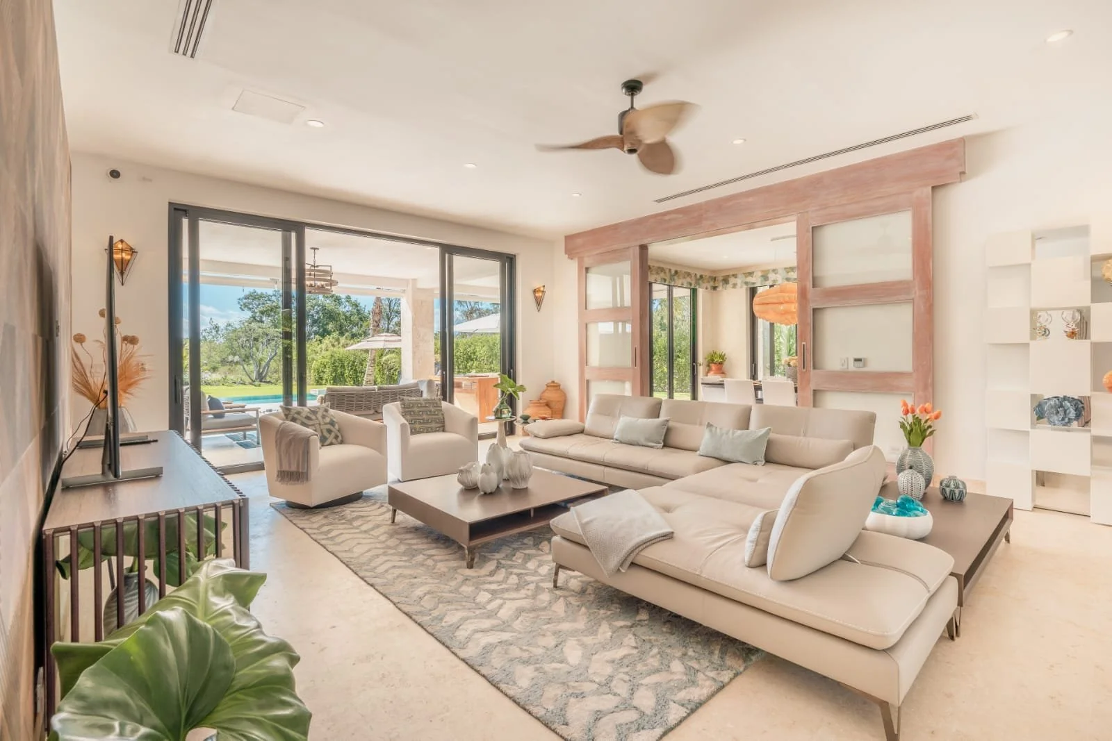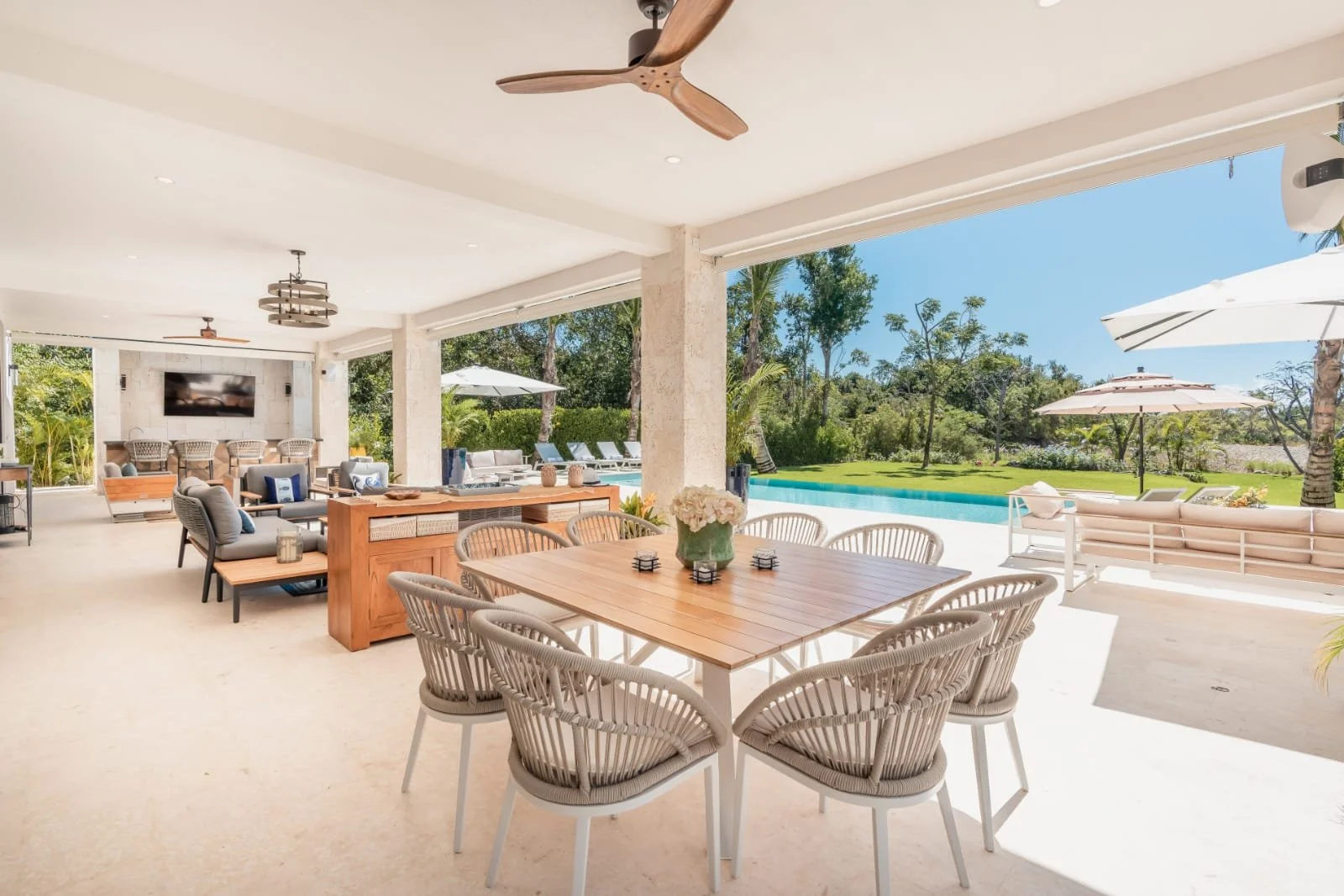 Hacienda B34, located in our HACIENDA GOLF COURSE, exudes elegance and luxury. It features a sprawling layout with a central structure, reflecting a modern yet tropical architectural style. The dark-tiled hip roof contrasts beautifully with the clean, white exterior walls, adding a sophisticated touch.