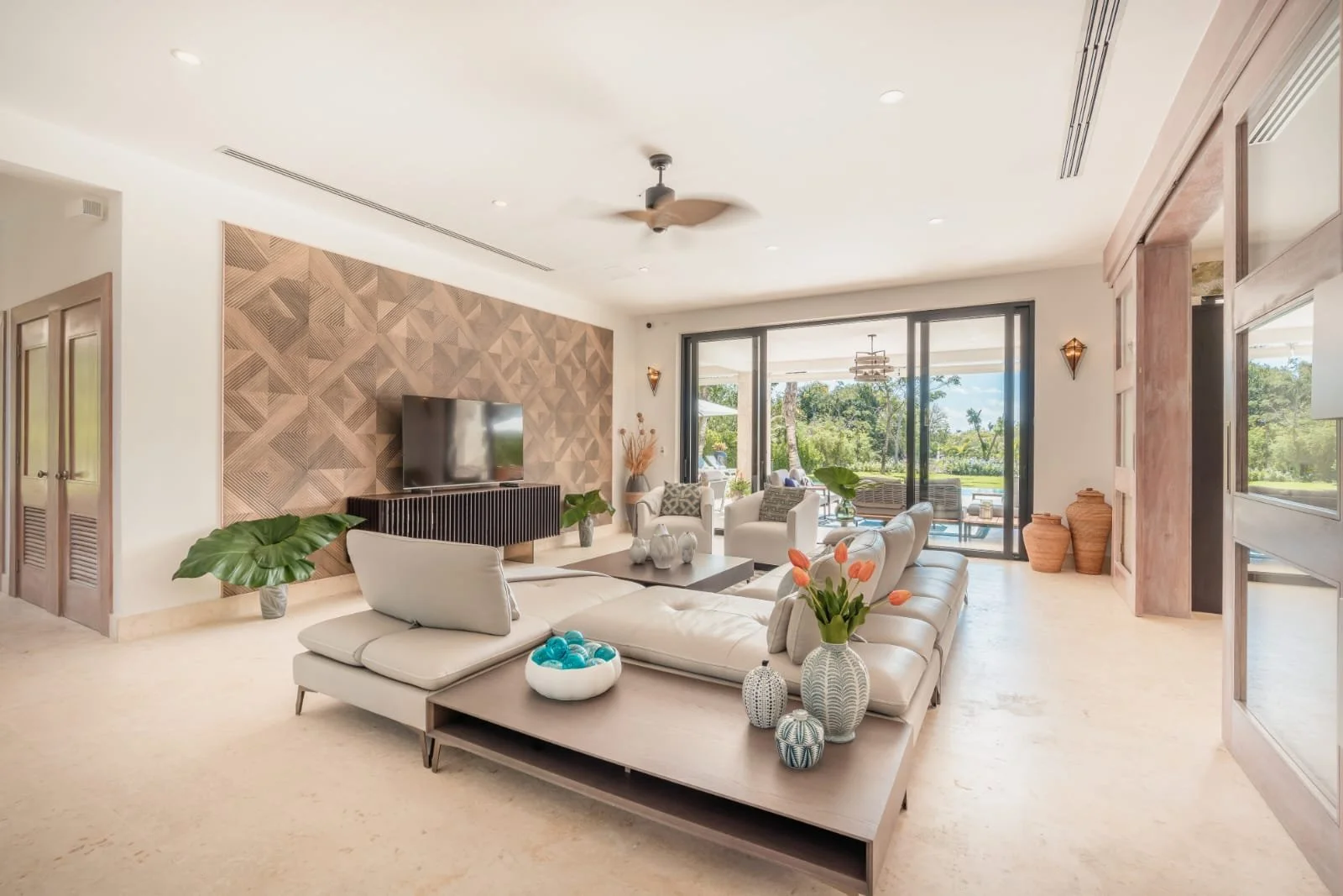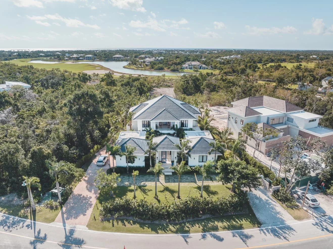 The backdrop includes a serene golf course with a tranquil lake, enhancing the property’s exclusivity and scenic appeal. This luxurious villa perfectly balances modern comforts with the natural beauty of its surroundings.